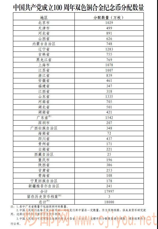 双色铜合金纪念币面额10元,直径27毫米,材质为双色铜合金,发行数量1.8亿枚(含留存历史货币档案3万枚),各省、自治区、直辖市双色铜合金纪念币分配数量如下:
