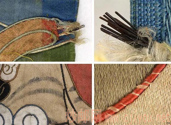 娴熟的工匠利用刺绣技术来塑造人物。他们特别运用了彩色丝线缠绕在马鬃芯上(示图上列左右),然后“缝”在织品上(右下图),勾勒出设计的轮廓,创造出立体的效果。此外,他们还在织物上手绘作局部加强(左下图)。