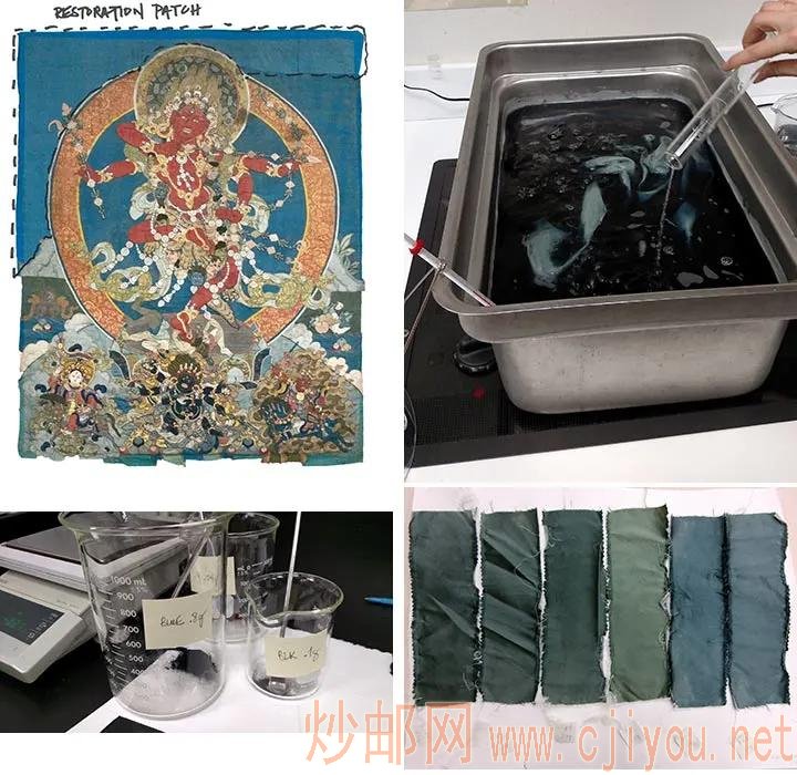 左上:该唐卡标示被移除的修复补丁部分。右上:染色。左下:测量染料。右下:各种色调样品罗列,以取得最佳匹配
