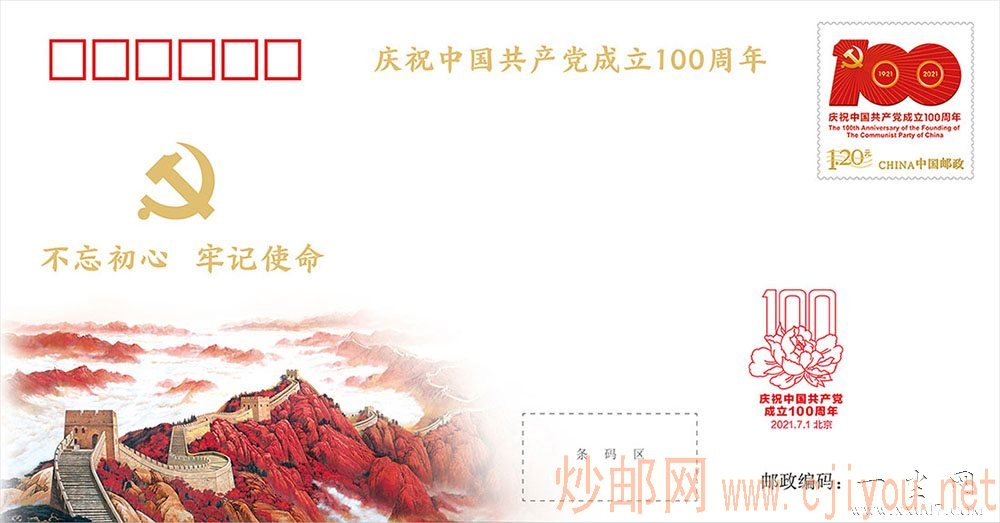 纪念封采用党徽、“不忘初心 牢记使命”金色字样、庆祝中国共产党成立100周年活动标识、中国共产党历史展览馆大型漆壁画作品《长城颂》等作为表现元素。