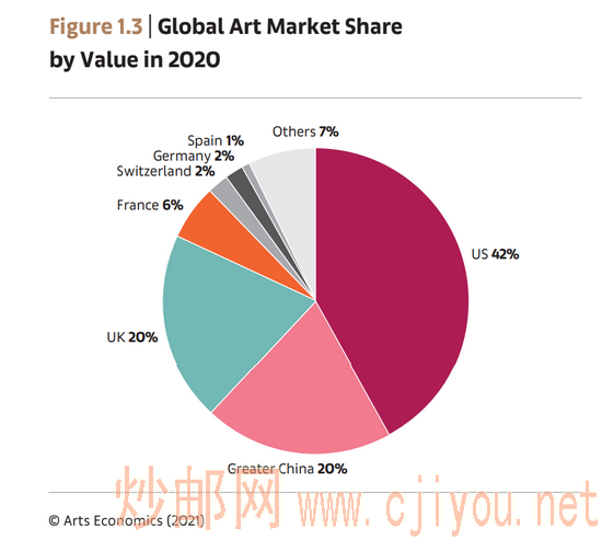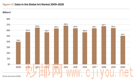数据来源:中国拍卖行业协会《中国文物艺术品拍卖市场2019统计年报》(不含银行渠道数据)根据巴塞尔艺术展&瑞银集团《2020全球艺术市场报告》(以下简称《报告》)显示,2020年全球艺术品销售额约为3200亿元,公开拍卖的销售额约为1140亿元。艺术品产业的快速发展,已成为全球文化建设与文化大发展、大繁荣的必然趋势。
