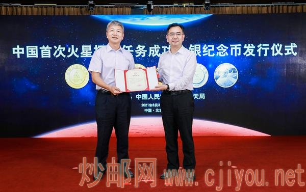 中国金币总公司副总经理李泽云代表中国金币总公司向国家航天局捐赠了证书编号为“2021”的中国首次火星探测任务成功金银纪念币。