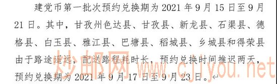 四川省甘孜州色达县、甘孜县、新龙县、石渠县、德格县、白玉县、雅江县、巴塘县、稻城县、乡城县和得荣县由于路途遥远,配送路程耗时长,第一批预约兑换时间推迟两天,预约兑换期为9月17日~9月23日,分配量为0.55万枚。
