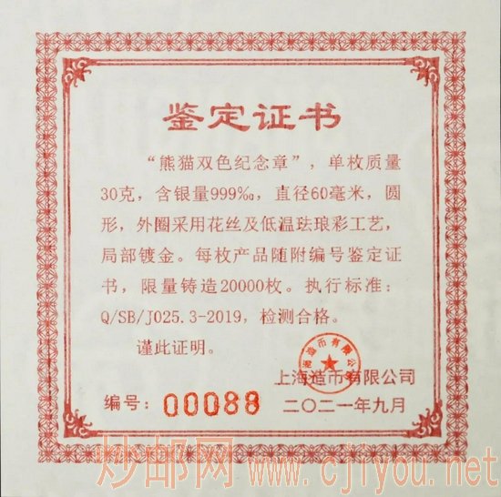 该章含纯银30克,成色999‰,圆形,直径60毫米,外圈采用花丝工艺,低温珐琅工艺,局部镀金工艺,限量铸造20000枚。