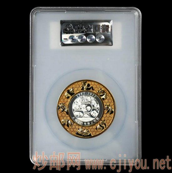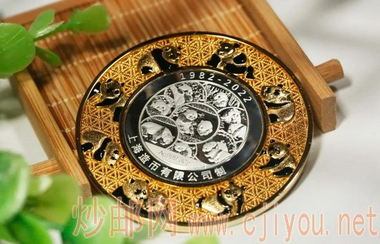 正面为花丝环绕中国发行的部分熊猫币的设计图案,并刊“1982-2022”,“上海造币有限公司制”字样。