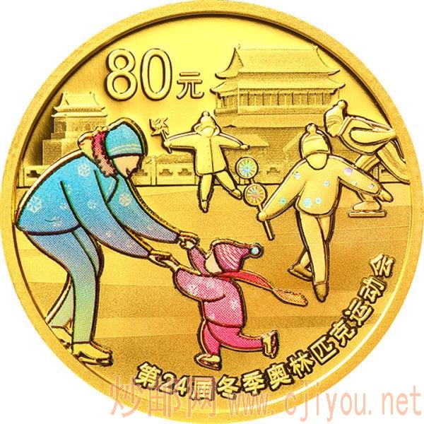 在一枚5克圆形金质纪念币背面,装饰风格的北京传统冬季运动滑冰造型、北京传统古建筑、冰场等元素组合设计出现。细看币面,一位身穿蓝衣的滑冰者正在牵着身着粉红衣服的小朋友在冰场上滑冰,远处则是在冰场上欢快驰骋的人们,其中一人还手握着风车。彩色的设计让整枚币显得亲切温暖,人物背后的古建筑颇具文化韵味,人物服装上的雪花元素增添了浪漫的气息。这枚纪念币,既是冬奥会主办城市北京的冬季运动场景的写照,也是许多人童年的冬天记忆,让人感受到大众参与冰雪运动的热情。