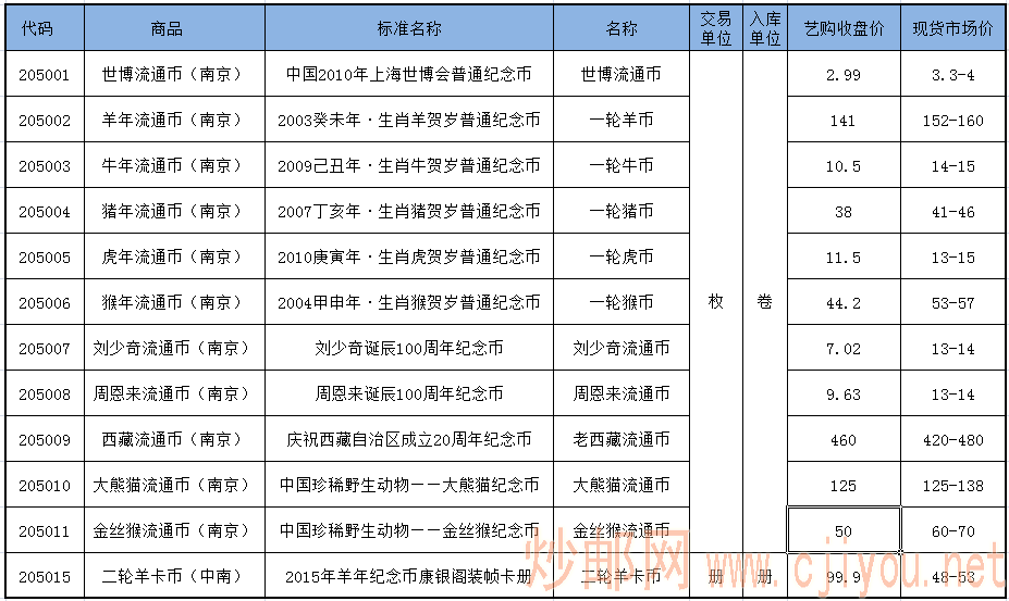 11.10金网艺购盘面价与现货市场价对比(纪念币篇)