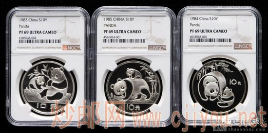 1983年-1985年熊猫27克精制银币各一枚,共三枚(部分带证书、NGC PF69)