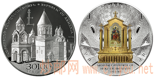 埃奇米河津圣母大教堂,又称埃奇米河津主教座堂,始建于4世纪,是亚美尼亚历史上第一座教堂。该教堂位于亚美尼亚西部城市瓦加尔沙帕特,靠近土耳其边境。2000年,埃奇米河津教堂与兹瓦尔特诺茨考古遗址被联合国教科文组织列入世界遗产名录。2020年,亚美尼亚中央银行发行了一枚“埃奇米河津圣母大教堂”银币。该枚银币的正面图案展示了教堂建筑的外观;背面图案前景为教堂祭坛,背景为教堂穹顶。