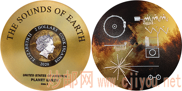 人类对宇宙有无穷的好奇心。上世纪七十年代,美国国家航空航天局将两个探测器旅行者1号和旅行者2号发射到太空,希望接触到宇宙中的其他外星高智慧生物。每个探测器都携带了一张“旅行者金唱片”。唱片为铜镀金材质,收录了用以表述地球上各种文化及生命的声音及图像,此外在片封套上也包括了一块高纯度的铀238,捕获此唱片的外星生命可据此推算出探测器的发射日期。2020年,库克群岛发行了一枚“旅行者金唱片”镀金纪念银币,该枚银币的背面图案还原了金唱片的外观。