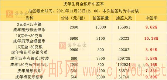 虎年金银币今天上午12点结束抽签,各规格报名次数总计71万+!本次抽签,150克彩色方银的中签率最低,仅0.16%!