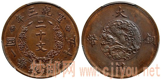 宣统三年大清铜币二十文试铸样币82.8万成交-摸鱼集藏