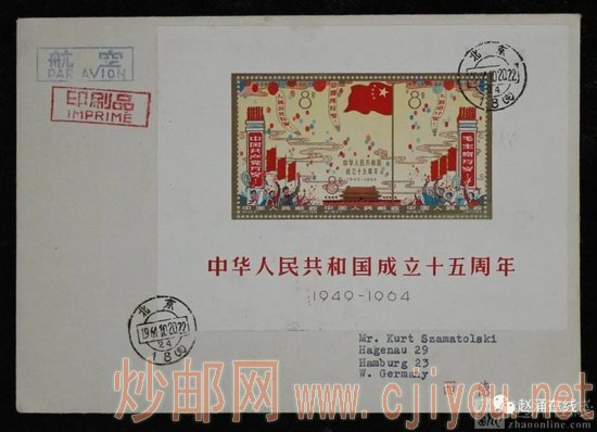 纪106M建国小全张总公司首日封北京航空印刷品寄德国一件、加贴纪特票三枚、销10月20日北京戳