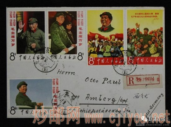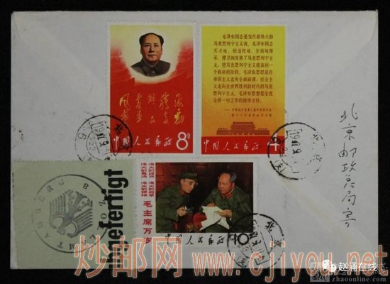 1967年9月北京挂号寄德国封一件、贴文2毛主席万岁一套、销北京戳