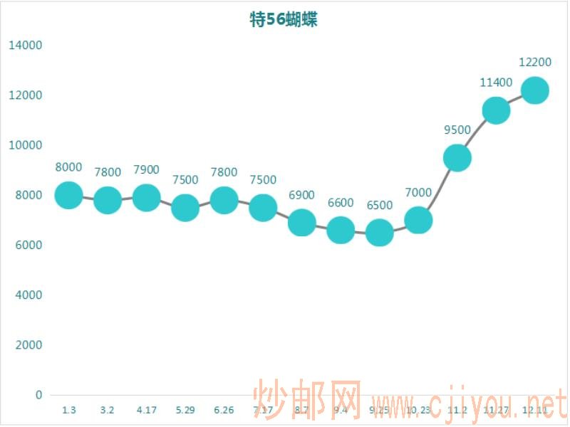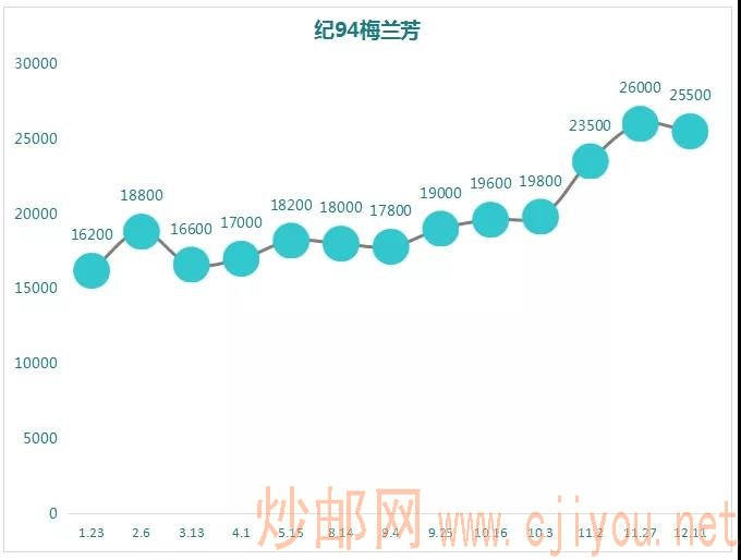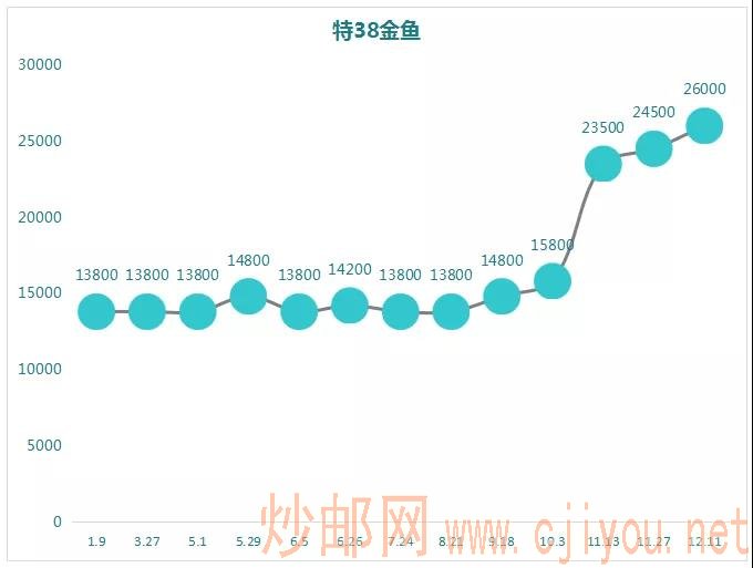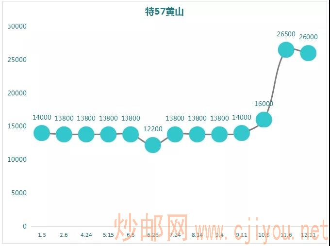 黄山的市场行情与金鱼极其相似,前期价格相当平稳,基本恒定在14000,也是11月随着市场高涨,价格大幅度出现上涨,目前最大涨幅比例117%。