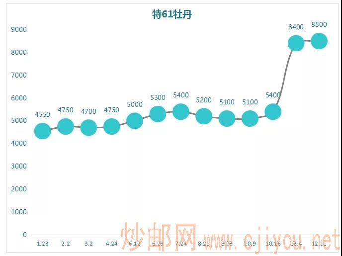 牡丹今年仍然是上涨的趋势,虽然在前期价格上涨幅度不高,但从本月开始价格是直线上涨的趋势。目前最大涨幅比例87%。