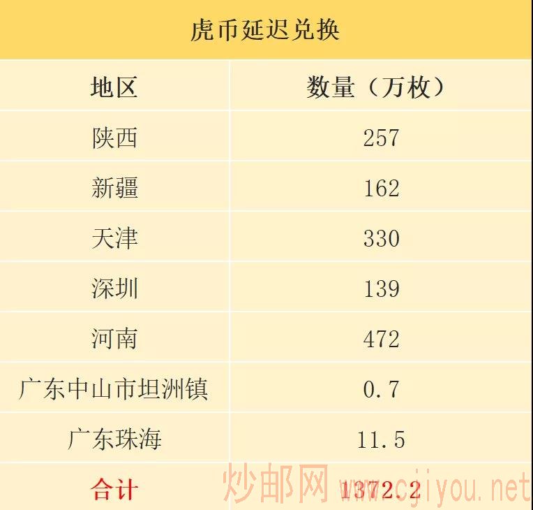 因为疫情防控原因,部分地区延迟虎币延迟兑换了,除了之前公布过的地区,这几天又新增了广东珠海市。总共有1372万枚左右的虎币目前无法兑换。