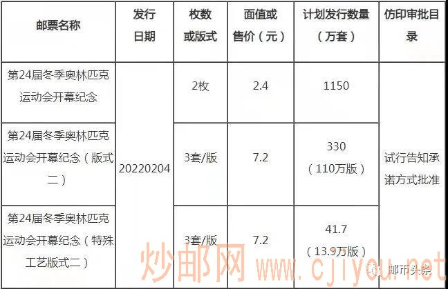 1150万套!国家邮政局公布《冬奥开幕纪念》新邮发行量! 日期:2022-01-26 来源:邮币头条 经国家邮政局审定,《第24届冬季奥林匹克运动会开幕纪念》纪念邮票计划发行数量、仿印审批目录情况如下: 这个发行量大家看着咋样呢?