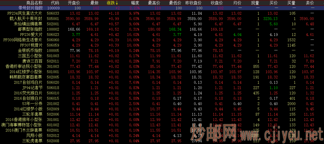环球文化——综指调整(无敌剑客)2022.3.1 日期:2022-03-01 民生直达从底部起来至今已翻倍,可关注。今日环球综合指数跌120.83点,跌2.02%,综合指数5870.35。分类指数方面邮票上涨,邮资封片下跌。成交活跃度方面:三轮羊,木兰辞,三轮虎交投依旧活跃,午盘持续跟进,领跑成交榜。抗战,夜宴图走势稳健微涨成交横盘收尾,买卖互动卖盘微涨大单投,成交量扩大。行情就是一个大舞台,不是所有的故事都可以陈述,人是需要某种信念来激励和约束的,人静而后安,安而能后定。特别风险提示,以上信息仅供参考,不作为投资依据。交易有风险,入市需谨慎。请投资人保持独立思考判断