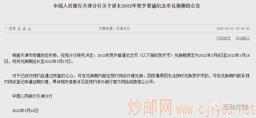 二虎币延期兑换的地区也有了些新变化。目前疫情反复,中国人民银行天津分行发出公告:兑换时间延期至3月17日;
