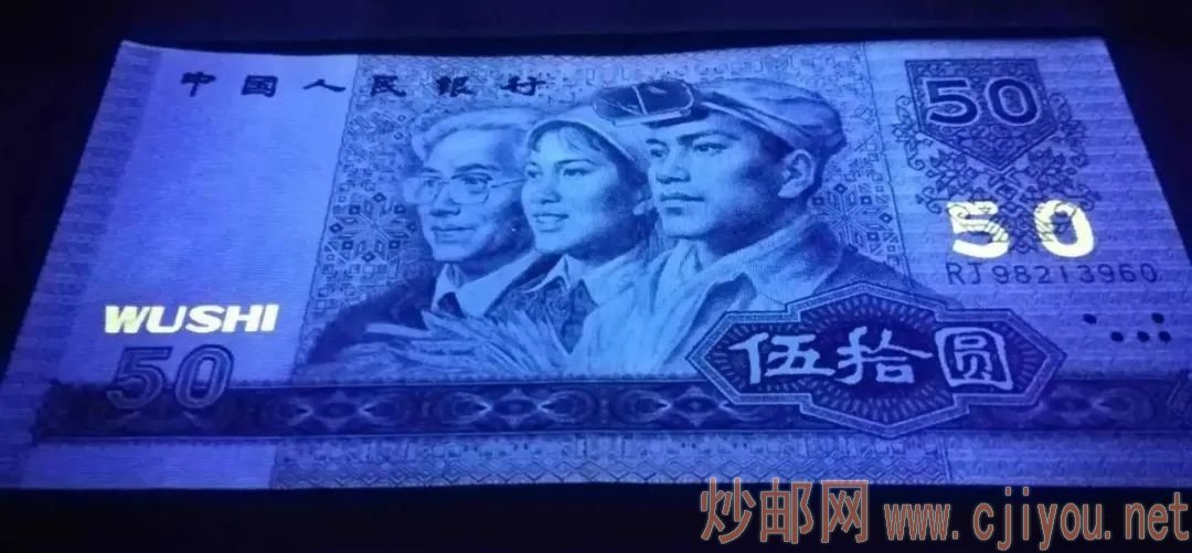 (3)、在以前大家用的方法是直接看荧光字样。但现在骗子也可以把荧光除去了。一般普通改的8050在正左下50元上空白处用紫外线灯照可看到“WU SHI”字样的为9050票。