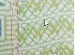 (4)、但遇到特殊的,看不到荧光的9050改的8050,我们也可从以下几个方面参考:其一:冠字和数字的油墨有深浅。下面这张只改了冠号的;其二:改冠号时,看残余的锁墨线和损伤的底纹;其三:不挖补,而是直接在(F)上加印(P),但(F)还在,这几个字你分辨得出吗?认真对比一下就明白了