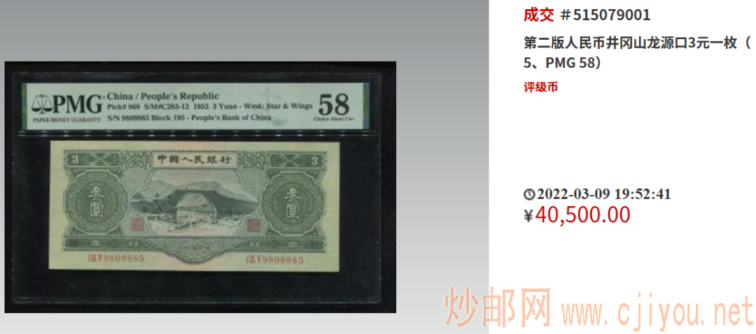 去年,一张PMG67EPQ冠军分的苏三元,在中晟春拍现场,以38万的高价落槌!下面这张PMG58分的苏三元,就在今年3月初以40500元的价格拍卖成交。