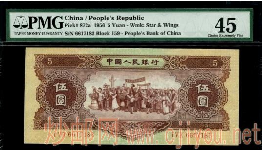 发行于1955年3月1日的红五元,当年是委托苏联代印的,纸钞制作工艺相当精致,拥有巨大社会意义与历史价值,但发行量相对不多。不仅如此,后期因中苏关系破裂,红五元也无法避免被回收销毁的命运。最终,受发行量少、流通时间短、回收较彻底等因素影响,目前红五元的存世量极其稀少。