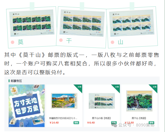 山其中《莫干山》邮票的版式一,一版八枚与之前邮票零售时,一个账户可购买八套相契合,所以很多小伙伴都好奇,这次是否可以整版兑付。随着邮票发行时间临近,集邮网厅把这两套邮票【寄递】销售页面上线,算是揭晓这个答案:可以看到官方态度是这两套邮票,假如购买够数的话,均是可以整版兑付。但不排除地方网点执行时,要避免员工脑血栓,开始大面积撕版。