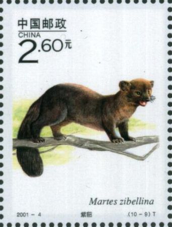 2001年3月16日,我国发行《国家重点保护野生动物(1级)(第二组)》特种邮票,紫貂再次入邮,其中第九枚,面值80分,图案就是站在树枝上警惕注视前方的一只紫貂。