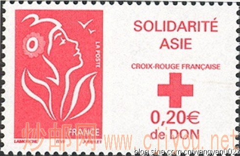 法国以前也曾采用过在普通邮票上添加相关图文的方式来发行附捐邮票。2005年1月10日,为了援助2004年底的印度洋大海啸受害者,法国利用了当时流通的“玛丽安娜”普票图案添加图文后,发行了一枚名为“支援亚洲”的附捐邮票(图2)。
