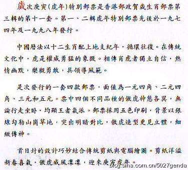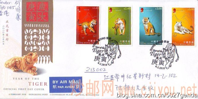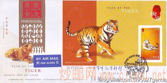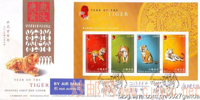 香港邮政发行岁次庚寅(虎年)特别邮票 日期:2010-02-23 来源:炒邮网 香港邮政于2009年2月6日发行岁次庚寅(虎年)特别邮票,本次发行一套4枚、小型张及小全张,同时发行正式首日封用于制作纪念邮品! (下图为无齿小型张首日封) (上图为一套4枚的首日封) (小全张首日封,感谢香港何国康先生赠封!)