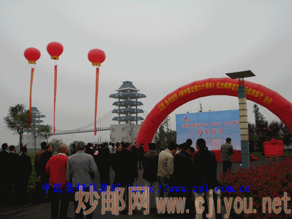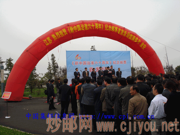 10月14日上午9时38分,江苏省淮安市在楚州区淮河入海水道管理处院内隆重举行《新中国治淮六十周年》纪念邮票(4-3)J淮河入海水道首发式,国家淮委、江苏省水利厅、江苏省集邮公司、淮安市人民政府等有关部门负责人出席了首发仪式,省集邮公司负责人宣读国家邮政局关于发行《新中国治淮六十周年》纪念邮票的公告,省水利厅负责人回顾淮河六十年治理所取得的成绩,淮安水利局负责人表示要以《新中国治淮六十周年》纪念邮票(4-3)J淮河入海水道邮票发行为契机做好淮水管理工作,淮安市政府负责人也在首发仪式讲了话。在五彩缤纷的礼花中(4-3)J淮河入海水道邮票露出了峥嵘。淮安市各区县及市区集邮爱好者近三百人参加了首发仪式,淮安市集邮公司为此制作了首日封、极限片、邮册等多种品供集邮爱好者选购,同时启用首日纪念戳一枚,楚州区邮政局为集邮爱好者在现场加盖三堡邮政日戳。