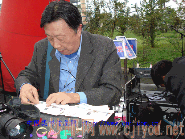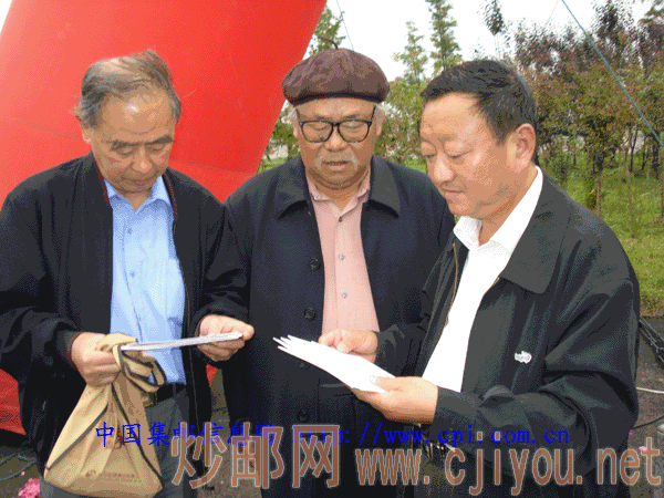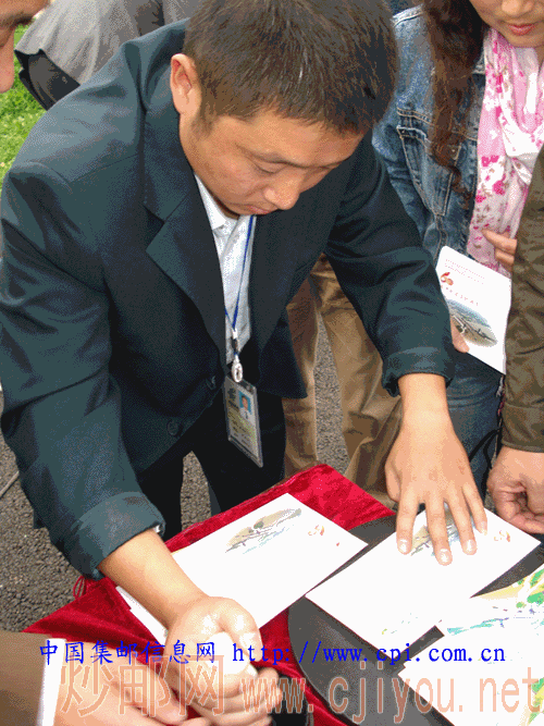 集邮爱好者在欣赏购得的首发式纪念邮品