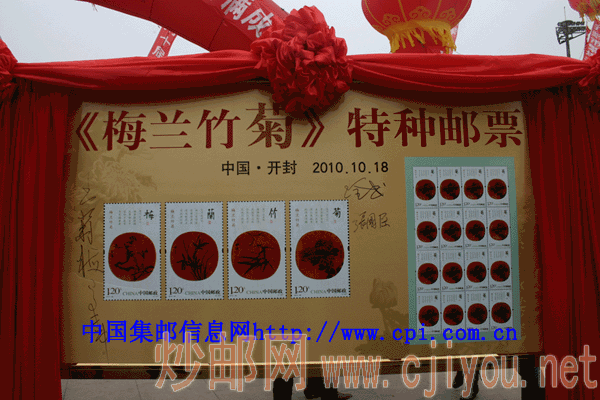 开封种植菊花的历史可追溯到1600多年前的南北朝。明清时代,开封养菊之风更盛,清朝乾隆皇帝来开封赏菊时亲赋诗词,留下“枫叶梧青落,霜花菊白堆”的诗句,至今亦留有乾隆的咏菊诗碑,可谓菊花之乡。特别是自1982年至今已开封已举办了28届菊花花会,吸引了数以万计的海内外宾客。首发式还特邀了《梅兰竹菊》特种邮票设计家王虎鸣为海内外集邮爱好者签名留念,河南省邮票公司印制了《梅兰竹菊》纪念封、《千年宋都菊香神州》邮折等八款邮品。开封市邮政局邮票公司、集邮协会刻制了纪念邮戳3枚,同时还为现场集邮爱好者的邮票真伪进行了鉴定。