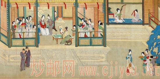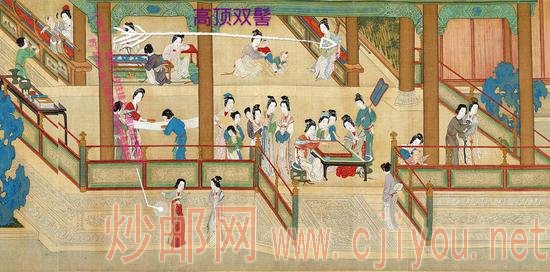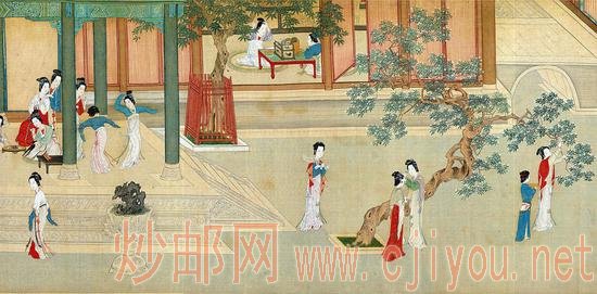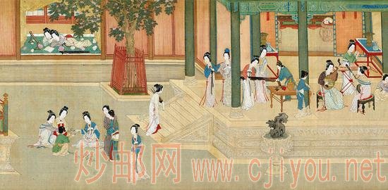 《汉宫春晓图》是明代画家仇英的绢画作品,该画作用手卷的形式描述初春时节宫闱wei(古代宫室两侧小门)之中的日常琐事:妆扮、浇灌、折枝、插花、饲养、歌舞、弹唱、围炉、下棋、读书、斗草、对镜、观画、图像、戏婴、送食、挥扇,画出后妃、宫娥、皇子、太监、画师凡一百一十五人,个个衣着鲜丽,姿态各异,既无所事事又忙忙碌碌,显示了画家过人的观察能力与精湛的写实功力。人物皆唐以来衣饰,取名汉宫,是当时对宫室的泛指。《汉宫春晓图》纵30.6厘米、横574.1厘米,被称为“中国十大传世名画”之一,收藏于台北故宫博物院。