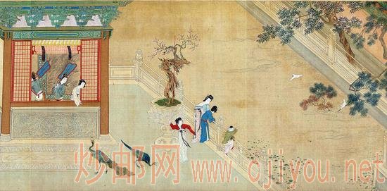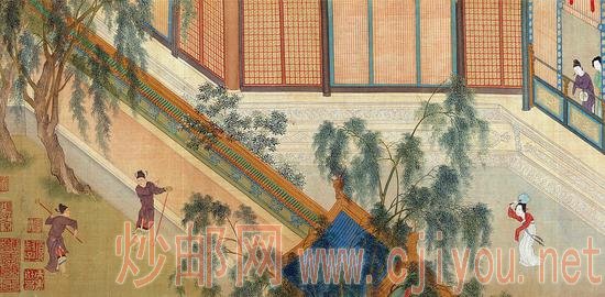 从画中看出,给人一种轻松活泼的欢快氛围。这与仇英的用色和构造的氛围是有很大的关系。在设色上很有讲究,以工笔重彩的笔法表现,设色研雅鲜丽, 给人一种朝气蓬勃的氛围。同时背景后面还配有仇英中所特有的青绿山水画法, 青绿山水勾勒工整精艳、设色中融和渲染、点皴, 透出文雅清新的韵味。红与青绿的配合,再有朱红暖色调的宫殿作大的背景衬托,更使得画面朝气蓬勃、其乐融融。无愧古人。