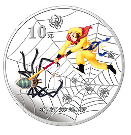 为了传承和弘扬中国的古典文学艺术,中国人民银行于2005年9月15日发行了中国古典文学名著——《西游记》彩色金银纪念币(第3组)一套。该套纪念币共6枚,其中金币2枚,银币4枚,均为中华人民共和国法定货币。其中的1盎司彩色银质纪念币,图案创意取材于《西游记》原著的第七十二回“盘丝洞七情迷本,濯垢泉八戒忘形”的故事。设计者特别将“棒打蜘蛛精”这一情节,作为1盎司彩色银币的背面图案,艺术地还原了孙悟空棒打蜘蛛精时的情形。