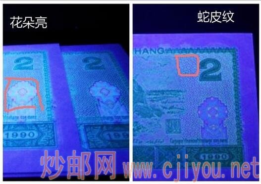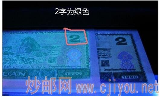 2元绿幽灵的特点:一、必须要有蛇皮纹的效果;二、背面的“2”必须是绿色;三、票面的花朵比较明亮,有荧光的效果。