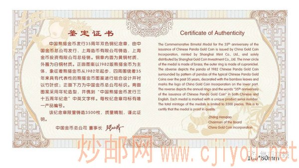 1982年9月15日,我国第一版熊猫金币正式发行。为纪念这一具有重大意义的历史事件,中国金币总公司于2017年9月15日正式发行“中国熊猫金币发行三十五周年双色铜纪念章”,这枚纪念铜章由上海造币有限公司铸造,上海金币投资有限公司经销。