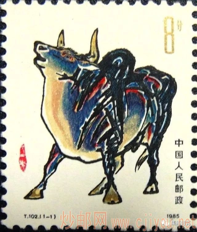 T102《乙丑年》邮票,全套1枚,面值8分,影雕套印,1985年1月5日发行,由任宇设计、阎炳武雕刻。