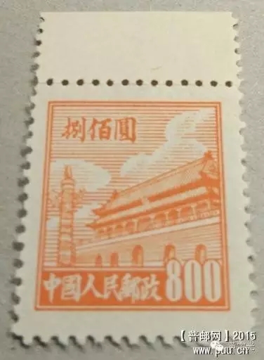 2、普1 800元有一个知名的子模特征票,就是16号票位上,“佰”字第二笔一竖上多一笔。此子模特征票因800元使用量巨大,不时能在旧票中找到,整版是200枚(20×10),找到子模特征票的几率是二百分之一。另800元有梳式齿及线式齿两种齿孔形态,故这枚子模特征票也能找到两种不同齿孔形态的票。