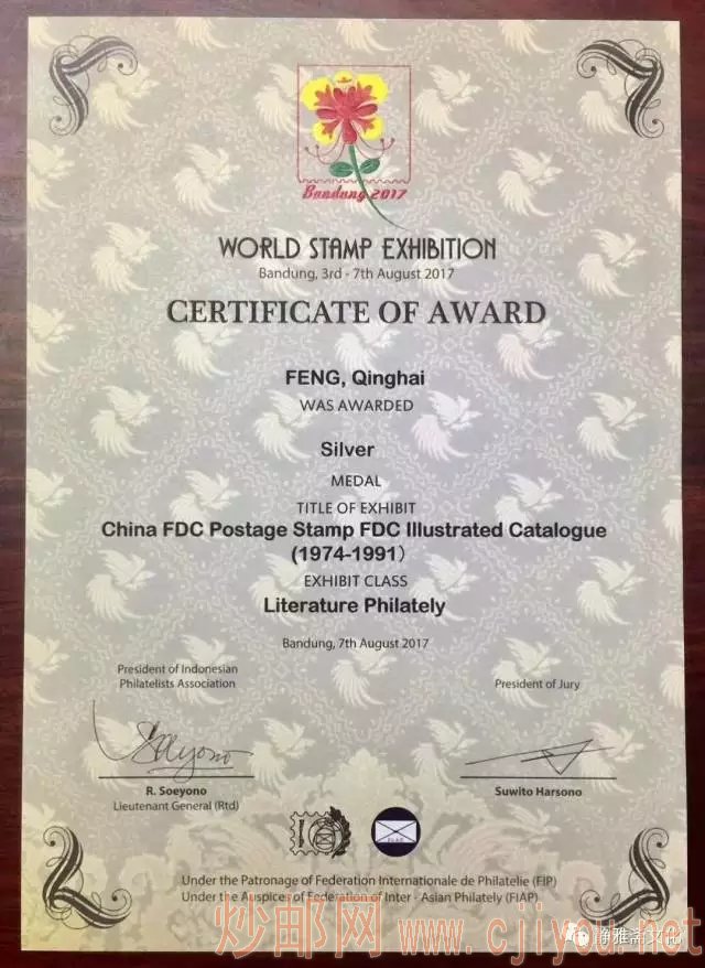 由北京静雅斋邮票公司董事长冯清海先生主编的《中国邮票首日封图鉴》(全三卷)代表我国参加印尼万隆世界集邮展览,首获文献类银奖。
