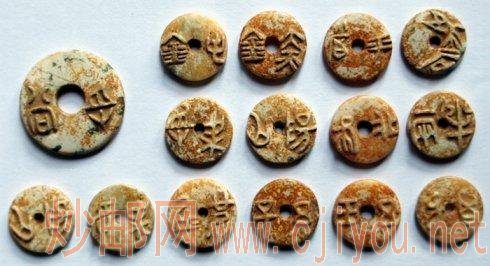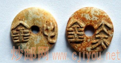 这些玉币的币文分别为:寽谷、屯金、赤金、平陶、离石、梁寽、阳山、行布、半两、?压、五子、五王、晋阳。这些都是山西境内的古地名。春秋时,基本上一城一国,这些小玉币,代表的都是子爵国,大玉币代表的是侯、伯国。上图中寽谷就是桥足布梁充釿五十当寽的前身,后人不认识谷字,认成当字了。谷应当是山西太谷一带,太谷是条河谷。还一可能是在山西东南部沁县附近,古时候叫谷邑。