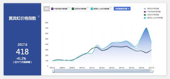 上图为:国画大师黄宾虹价格指数与中国书画价格指数、近现代价格指数及黄宾虹-山水价格指数的对比