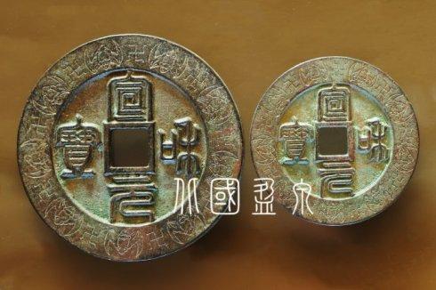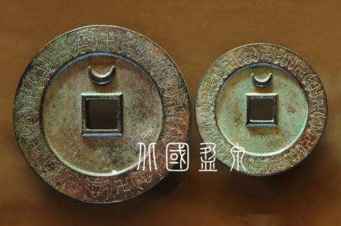 直径96.5毫米和直径71.7毫米的两等“宣和元宝”篆书背上仰月外缘蝙蝠万字纹大钱,除了大小薄厚不同,其余形制、钱文书法、阴刻纹饰都一模一样。