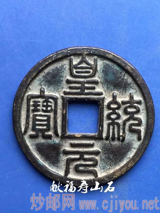 这次展出的“皇统元宝”是枚奇特的钱币,它型体较大,诸谱不载。钱经为55MM、穿经12MM、厚3.5MM,重44.74克,熟坑、细缘细廓、包浆自然、字体深峻,铸制异常精美,其可能是枚样币仰或镇库大钱,用强磁可以吸附,并有母钱之风,是枚不可多得的珍品,请泉友鉴赏。