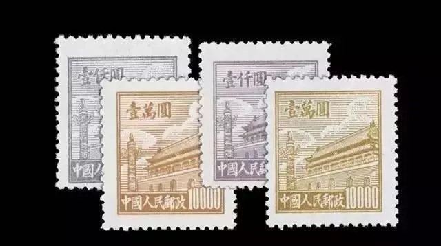 这两套的图案看上去完全一样,特别是两套邮票中都包含蓝紫色的1000元面值(旧币)和棕黄色的10000元面值(旧币),放在一起简直难以分辨。