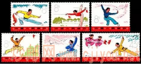 1975年6月10日发行,本套邮票共6枚。图案包括拳术、器械和对练三大类型。