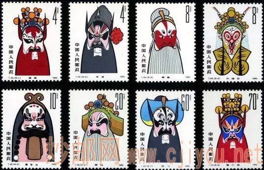 1980年1月25日,为了反映中国戏曲中独具特色的脸谱艺术,中华人民共和国邮电部发行了T45《京剧脸谱》邮票1套,全套8枚。